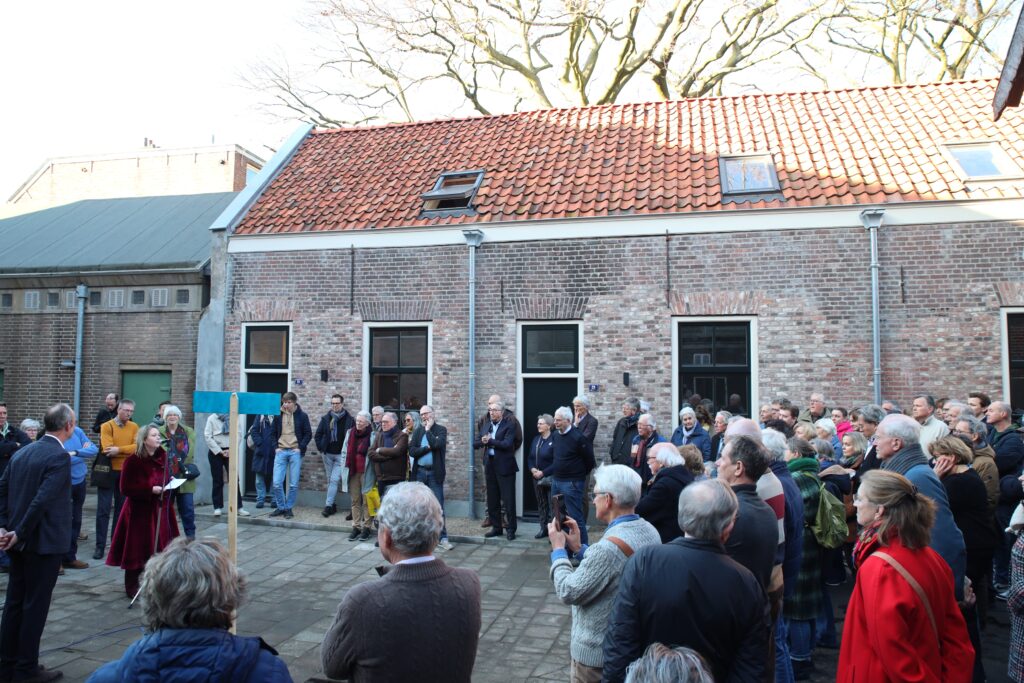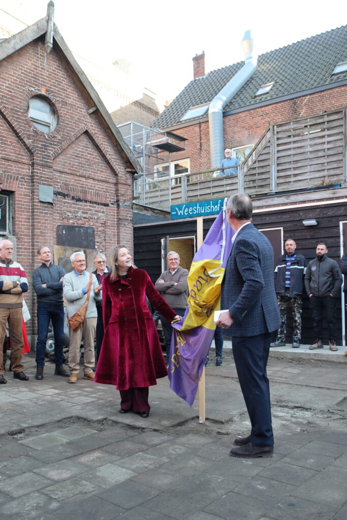 Maar door de herbouw van de drie huisjes is het belangrijkste gedaan. Tot tevredenheid ook van Marike de Nobel, wethouder Erfgoed. “Hier mogen jullie als Stadsherstel heel erg trots op zijn. Jullie hebben er een betekenisvolle plek van kunnen maken. De binnenstad is voor iedereen”, complimenteerde ze directeur Tebbe. Samen onthulden ze het straatnaambordje – ook voorlopig – van het Weeshuishof. “Wat ik belangrijk vind, is dat deze huisjes bedoeld zijn voor mensen met een kleine beurs. Niet voor iemand met een volle bankrekening die een stukje van de binnenstad wil kopen. En kijk nou eens naar deze huisjes. Je kunt ze tiny houses noemen, maar ik noem ze liever cute houses. Zo leuk vind ik ze.”
